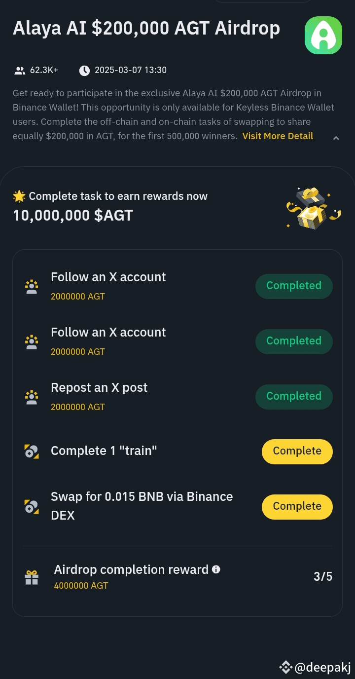 Get ready to participate in the exclusive Alaya AI $200,000 AGT Airdrop in Binance Wallet! This opportunity is only available for Keyless Binance Wallet users. Complete the off-chain and on-chain tasks of swapping to share equally $200,000 in AGT, for the first 500,000 winners.