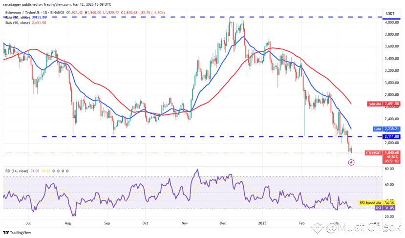 Ether ETH $1,907 fell below the $1,993 support on March 9 and extended the decline, reaching $1,754 on March 11.