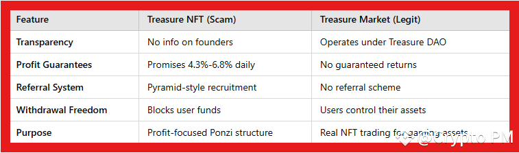 Treasure NFT is a textbook case of a Ponzi scheme disguised as an NFT platform. Its unrealistic profit claims, withdrawal issues, and referral-based revenue model all point to a scam designed to exploit investors.