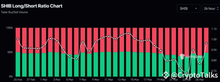 Another key indicator supporting this new bullish outlook is SHIB’s long-to-short ratio. Data from Coinglass shows that the long-to-short ratio currently stands at 0.96, indicating steady and rapid improvement from a 0.68 low on March 23.