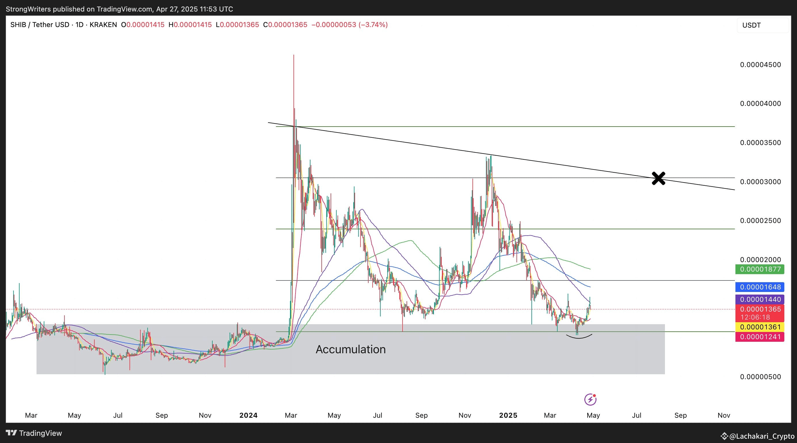 Notably, the bullish sentiments resonate with StrongHedge, which predicts a lower high price action on Shiba Inu’s daily chart. The prominent chart highlighted that SHIB bounced from an accumulation zone with its April 9 rejection of lower prices, contributing to the asset’s northward momentum.