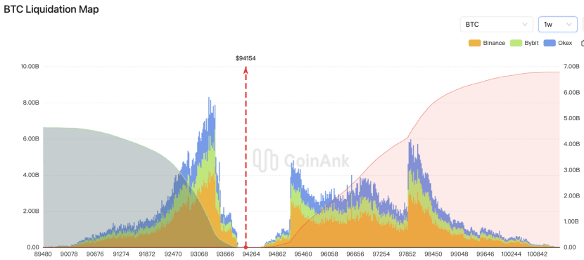 CoinAnk liquidation map data shows that if BTC breaks $97,900, the cumulative short liquidation intensity on mainstream CEX will reach $4.389 billion. Conversely, if Bitcoin falls below $89,480, the cumulative long liquidation intensity on mainstream CEX will reach $4.636 billion.