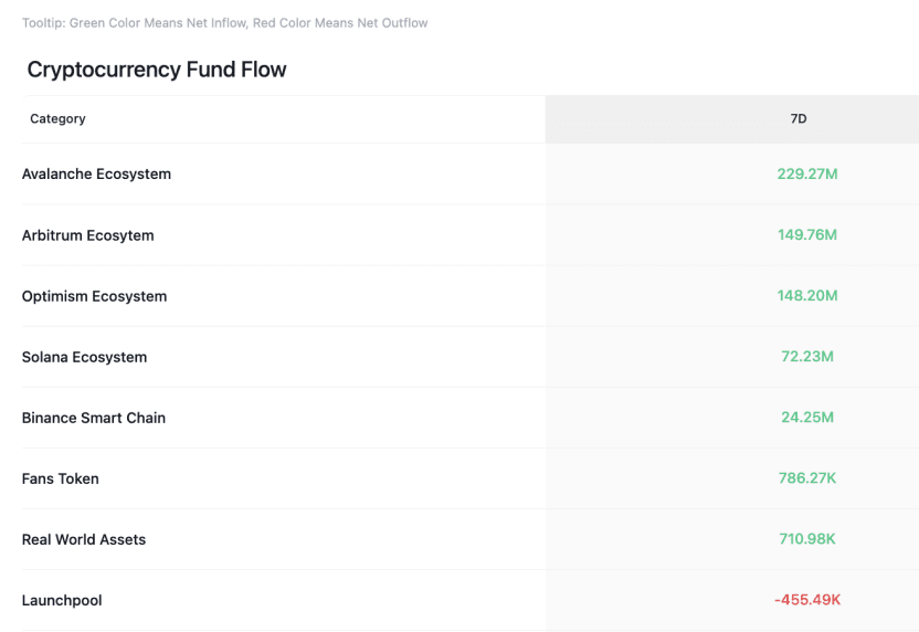 CoinAnk data shows that in the past week, the crypto market, categorized by concept sectors, has seen net inflows in the Avalanche ecosystem, Arbitrum ecosystem, Optimism ecosystem, Solana ecosystem, Binance Smart Contract, fan tokens, and Real World Assets.