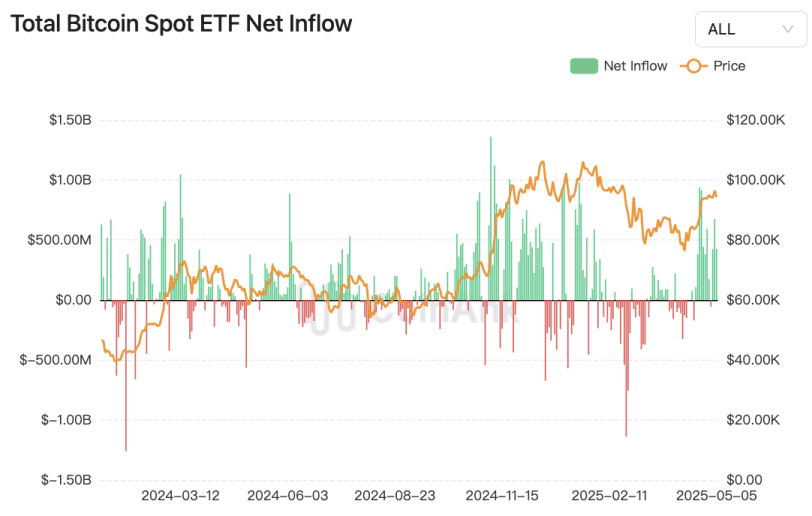 In terms of fund scale, the total net inflow of Bitcoin ETFs has exceeded $40.2 billion, approaching the historical peak (of $40.78 billion on February 7, 2025). BlackRock's IBIT fund continues to lead, reflecting the increasing tendency of institutional investors to allocate Bitcoin through compliant channels. It is noteworthy that the continuous net inflow of ETFs and the disparity with miner output may raise concerns about mid- to long-term liquidity in the market. If demand remains high while supply is constrained by inefficient mining post-halving (daily output of about 450 Bitcoins), the supply-demand conflict may further escalate.