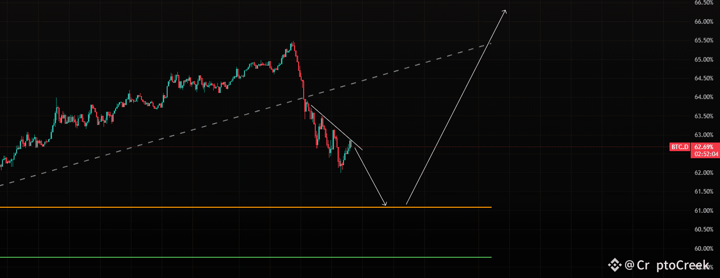 BTC.D should continue to fall to its Fib level below before seeing any rebound. Alts are looking good here.