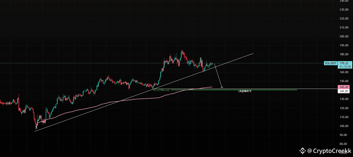It is time for SOL to start dropping from this specific trendline and take a nice correction towards 141, the level aligns with the 0.5 Fib level along with the anchored VWAP. Potentially shorts are more likely to be a win here. And the exit level from it is actually a great level to add SOL to spots.