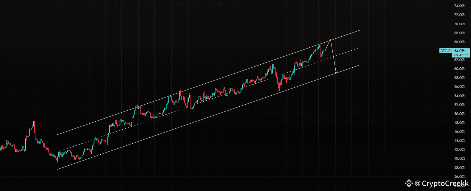 BTC.D has been climbing up for a while now. Respecting its midline historically quite a lot of time. I think it will create another high.