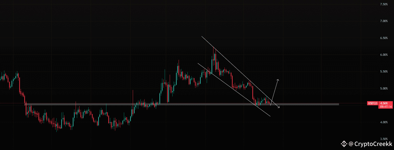 BTC.D has been climbing up for a while now. Respecting its midline historically quite a lot of time. I think it will create another high.