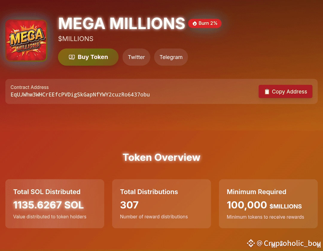 $MILLIONS has distributed 1,200 SOL across over 300 JACKPOT rounds, with 3,000 holders winning in the past three days. It stands out as the top-performing project in rewards, tokenomics, and innovation. Introducing a unique reward and burn mechanism, $MILLIONS enables holders investing just 0.2 SOL to potentially win 10x to 50x their investment. Eligibility requires holding at least 100,000 $MILLIONS tokens, with winners selected randomly.