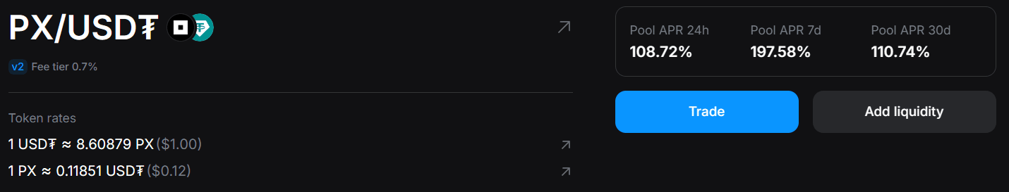 The PX/USDT pool on the STON.fi DEX currently has nearly 200% APR on average over the past week. And the tournament has not even started yet. By the way, during the tournament, those wanting to top up PX tokens or withdraw them will most likely use the PX/USDT pair to precisely lock in their winnings or deposits.