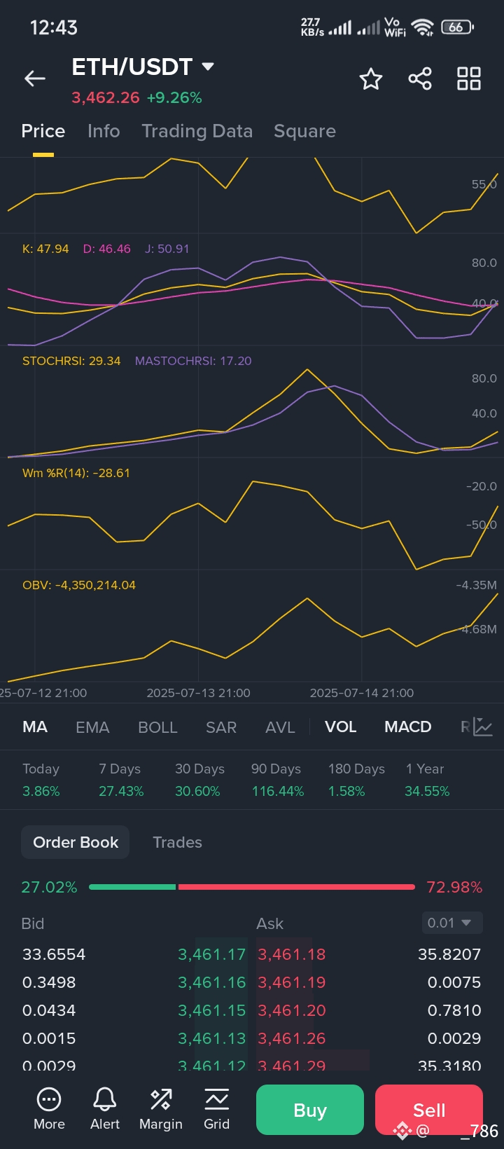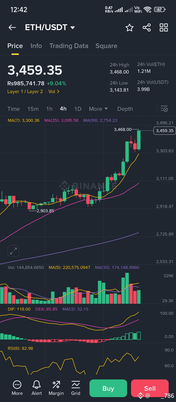 Current Price: ETH stands strong at $3,462 (as of analysis). Over the past 24 hours, it has seen a high of $3,468.00 and a low of $3,143.81, with a trading volume of 1.21M ETH ($3.99B USDT).