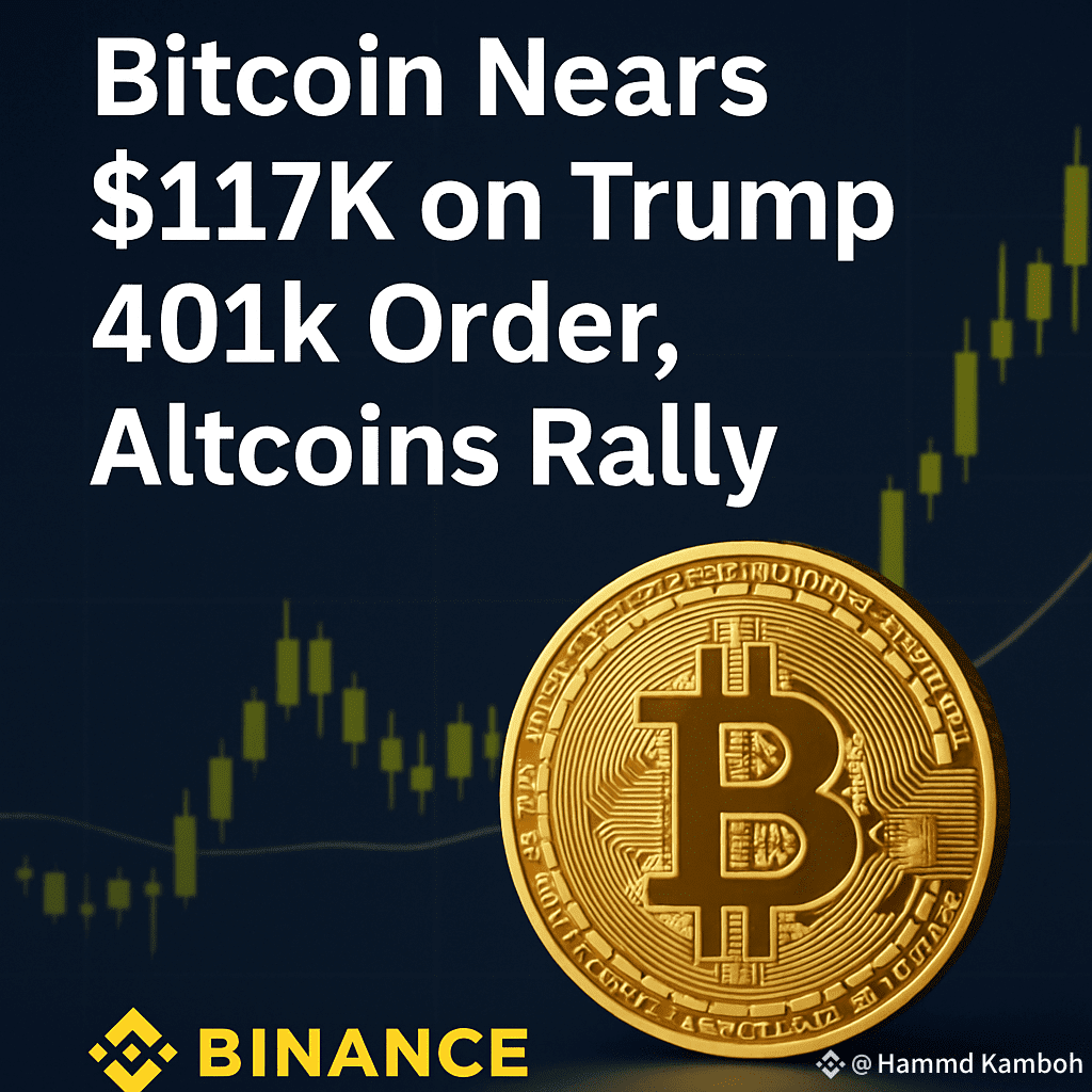 Bitcoin’s $BTC steady climb continued on Friday, briefly approaching the $117,000 mark after U.S. President Donald Trump signed a landmark order allowing more alternative assets — including cryptocurrencies — to be included in 401(k) retirement accounts.