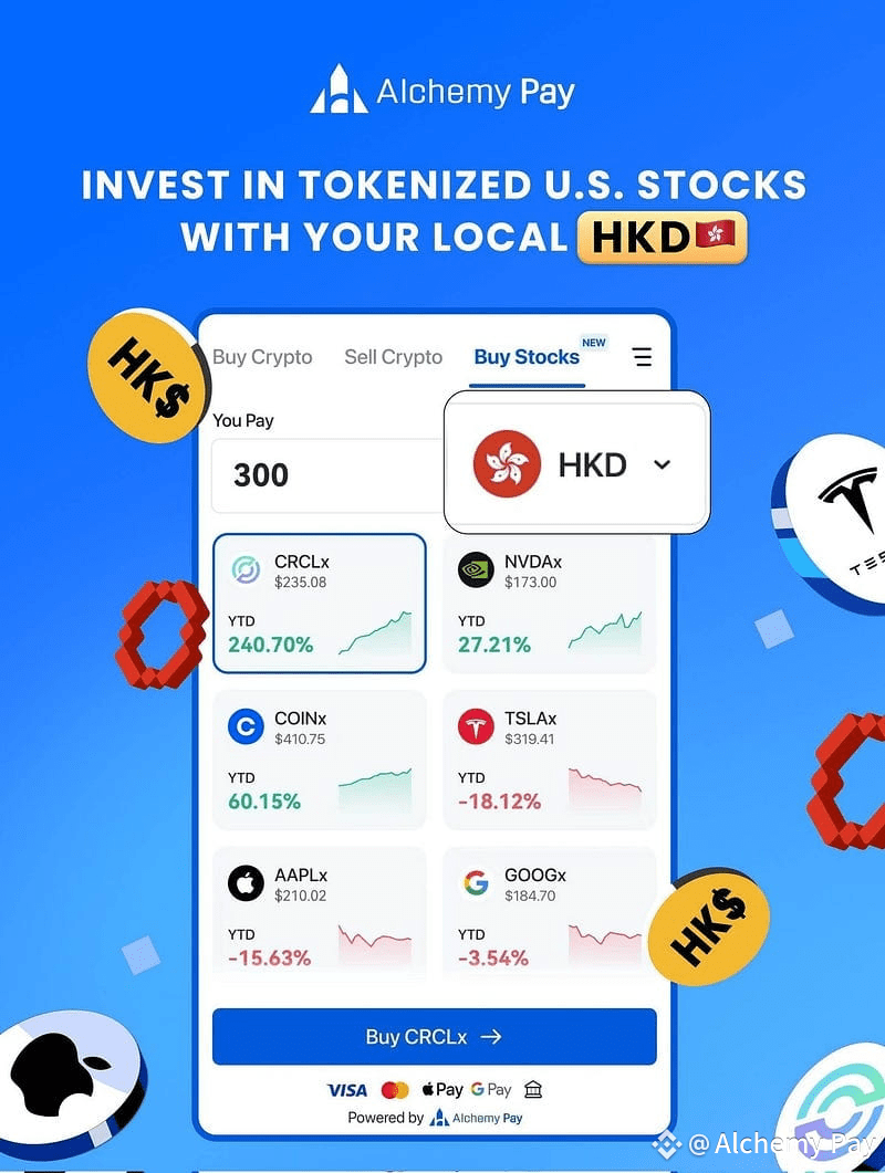 With Alchemy Pay RWA platform, use HKD to invest in tokenized U.S. stocks & ETFs — no crypto needed. Fiat in, stocks out. Easy, fast, borderless.