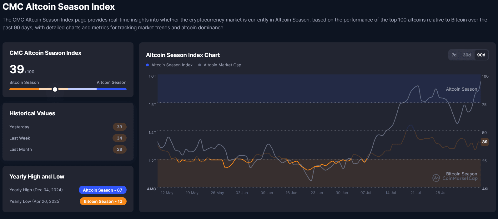 Currently, the Altcoin Season Index shows a result of 39, meaning we are closer to a Bitcoin season than to an altcoin season.