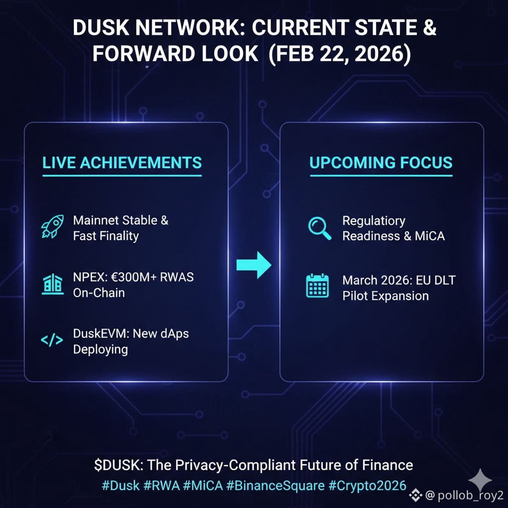 As of February 22, 2026, Dusk Network ($DUSK) continues to build significant momentum post-Mainnet. The focus remains steadfast on solidifying its position as the leading privacy-market layer for institutional-grade Real-World Assets (RWAs).