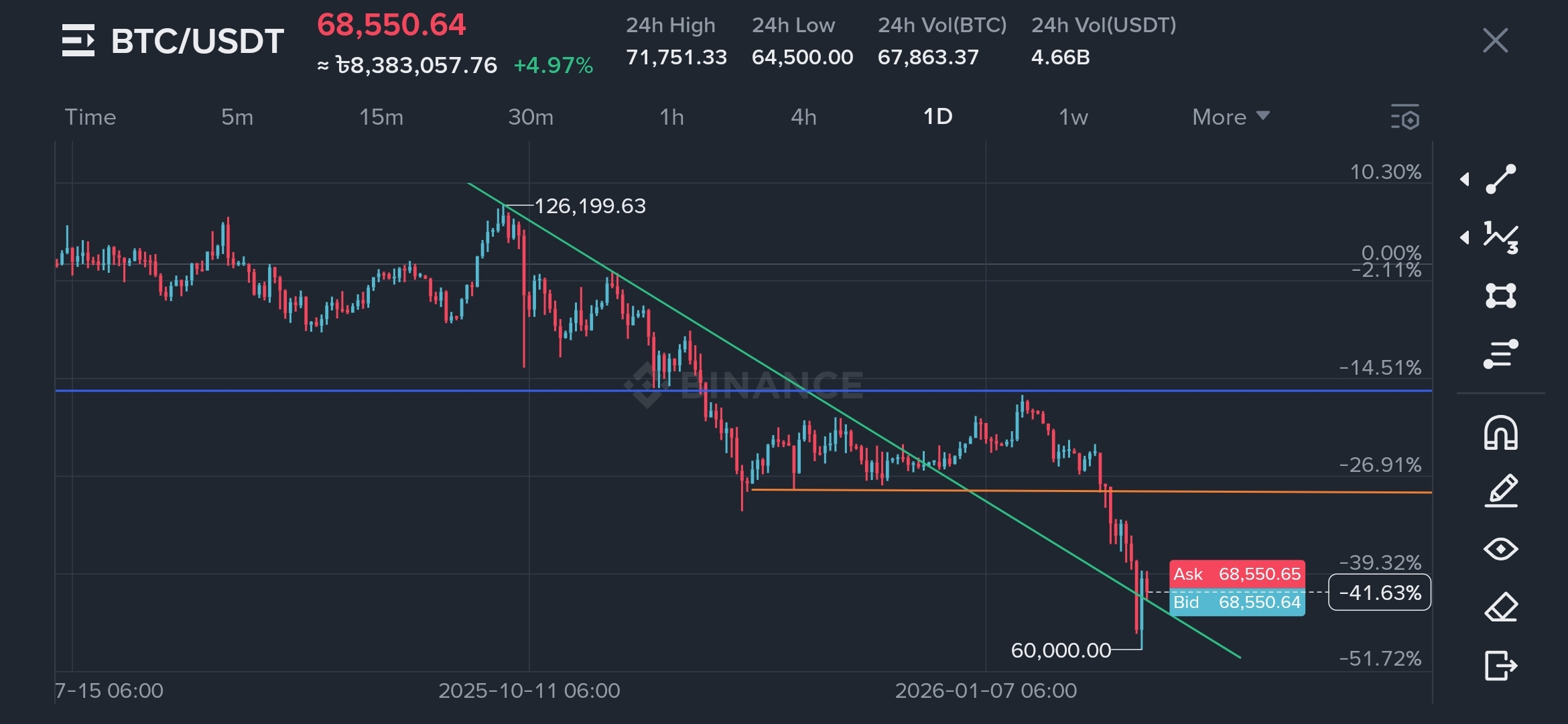 $BTC is still in a bearish trend, trading around $68,550 after months of lower highs and lower lows. The price is testing a long-term descending trendline holding above it could hint at a slow shift in momentum, but failure could send BTC back toward the $60k support level. Recent sharp bounces show that buyers are defending key floors, but the market is still fragile.