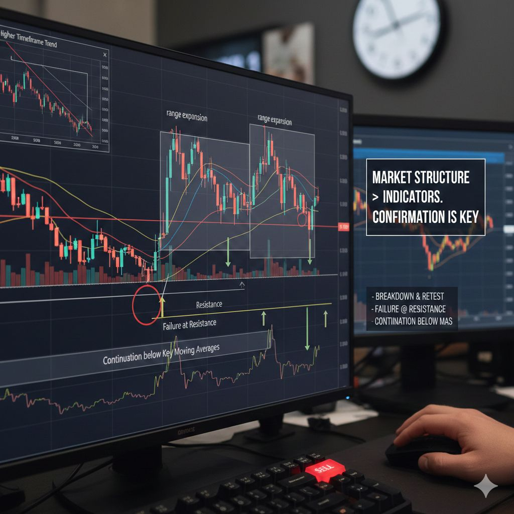 From a technical standpoint, market structure becomes more important than indicators. Bear markets are dominated by range expansions, false breakouts, and short-lived relief rallies. Trades should be taken only after confirmation of structure such as a clear breakdown-and-retest, failure at resistance, or continuation below key moving averages. Trading within the direction of the higher timeframe trend increases statistical edge.