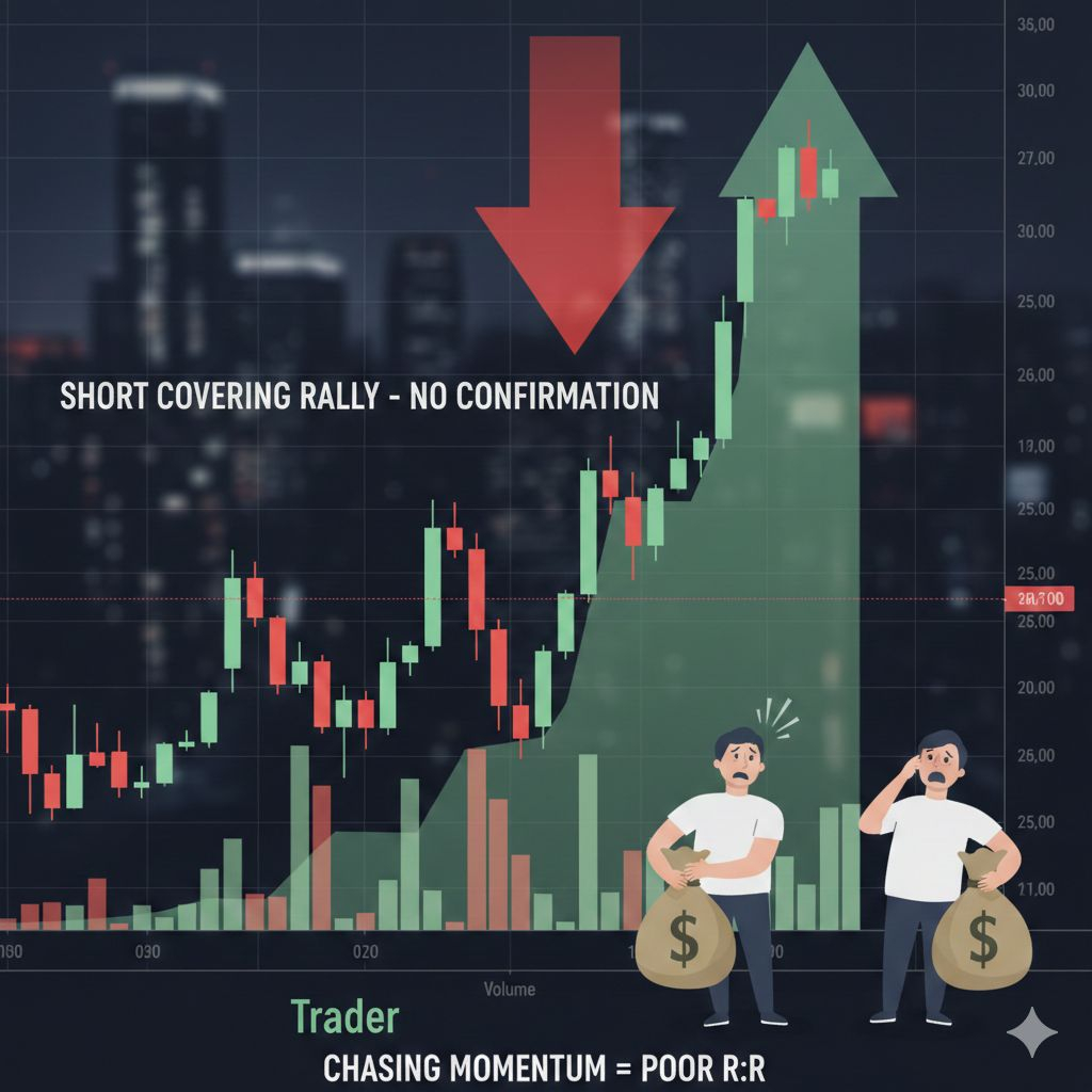 Liquidity behavior also plays a critical role. Sudden upward moves during bear markets are often driven by short covering rather than genuine demand. Without sustained volume and acceptance above resistance, these moves frequently reverse. Chasing momentum without confirmation exposes traders to unnecessary risk and poor reward-to-risk ratios.