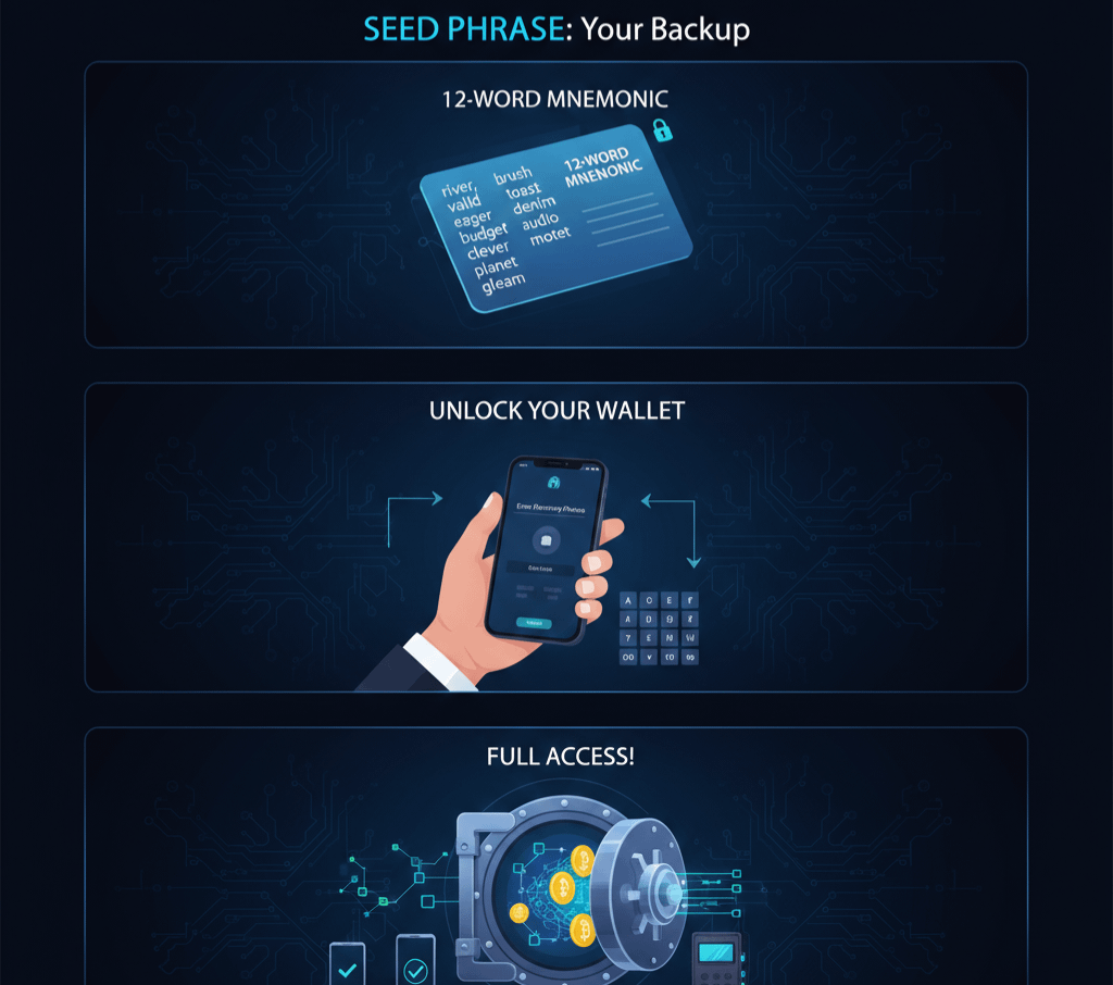 A seed phrase sometimes called a recovery or mnemonic phrase is your backup plan. It’s a list of 12, 18, or 24 simple words that can recreate your entire wallet, including all your private keys.