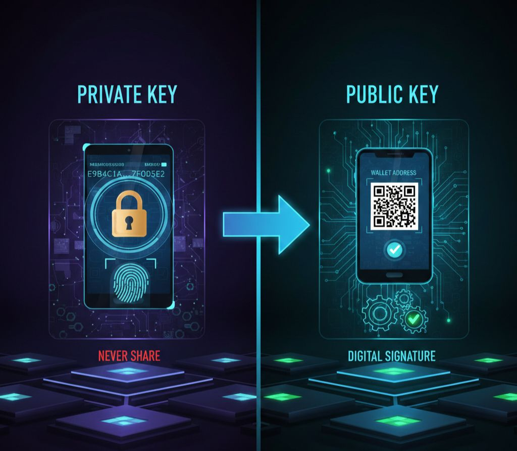 Public key: Derived from your private key through one-way math. It’s used to generate your wallet address (what you share to receive funds) and to verify signatures.