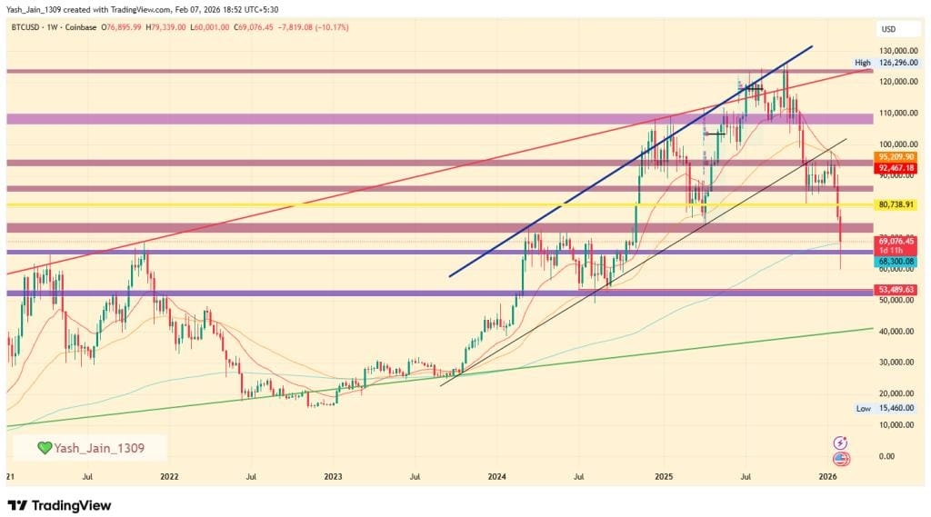 By mid-February 2026, Bitcoin trades around $69,000–$70,800, after briefly falling below $61,000. That marks a 45–50 percent decline from the peak. Significant, but still less severe than past corrections that often exceeded 70 percent.