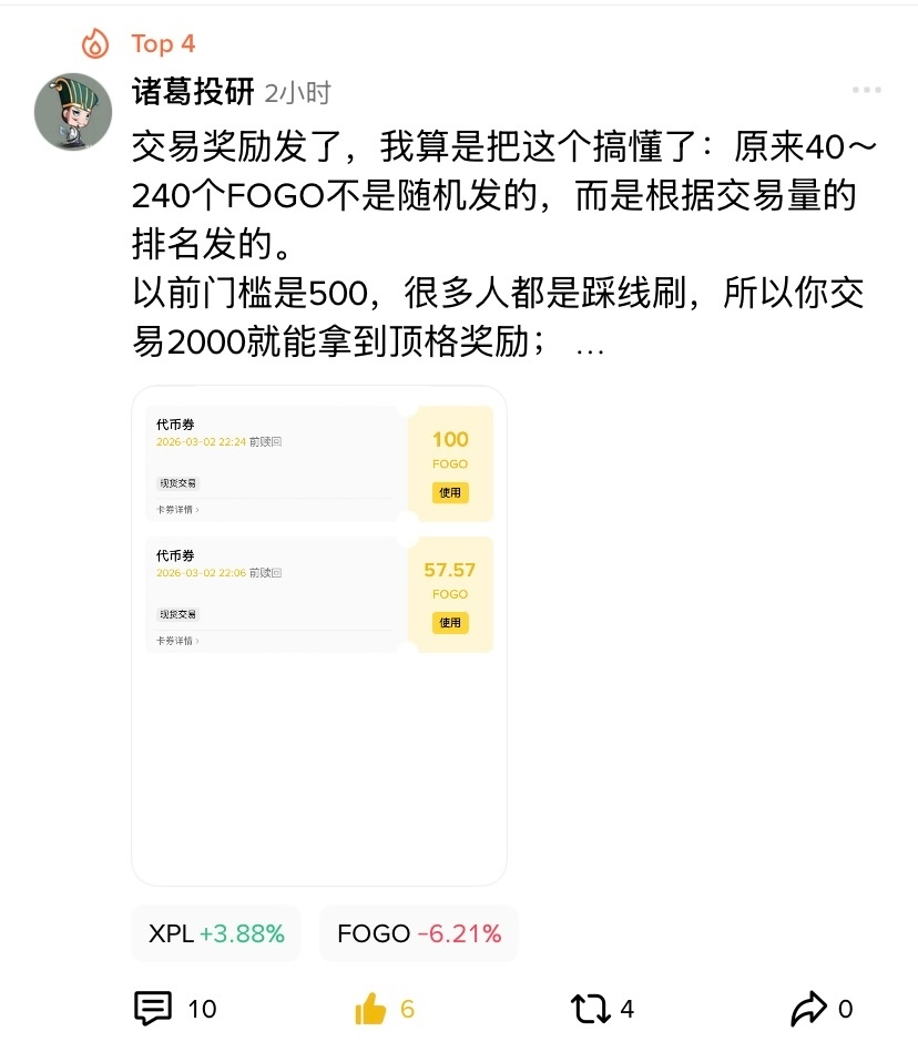 2. The rewards issued yesterday were from last month's spot trading activity, with rewards of 40–240 $FOGO. According to trading volume ranking: the top 15,000 can receive 240; those ranked 15,000 to 35,000 can receive 100, and the rest receive the minimum 40. All accounts with trading volumes of 1000u did not rank in the top 76,000 and uniformly did not receive the minimum of 40. At least 1100u or more is required.