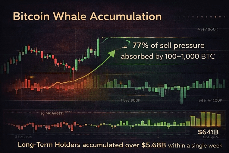On-chain flows show wallets holding 100–1,000 $BTC absorbed roughly 77% of the sell pressure during the dip. These were not speculative entries. Long-Term Holder realized cap change flipped decisively positive, with over $5.68B added within a single week. This absorption created clear downside rigidity near current price levels.
