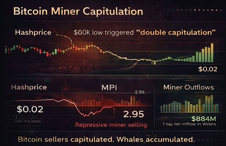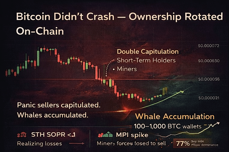 When price dipped into the low $60K region, panic dominated the narrative. Short-term holders and miners capitulated almost simultaneously, creating the impression of broad market weakness. On-chain data shows something very different: sell-side exhaustion.