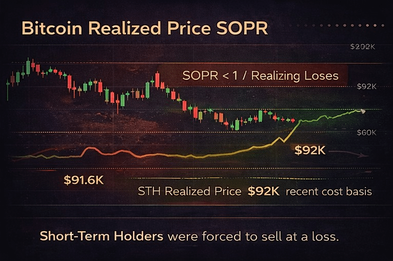 Short-Term Holder realized price hovered near $92K, leaving late entrants deeply underwater