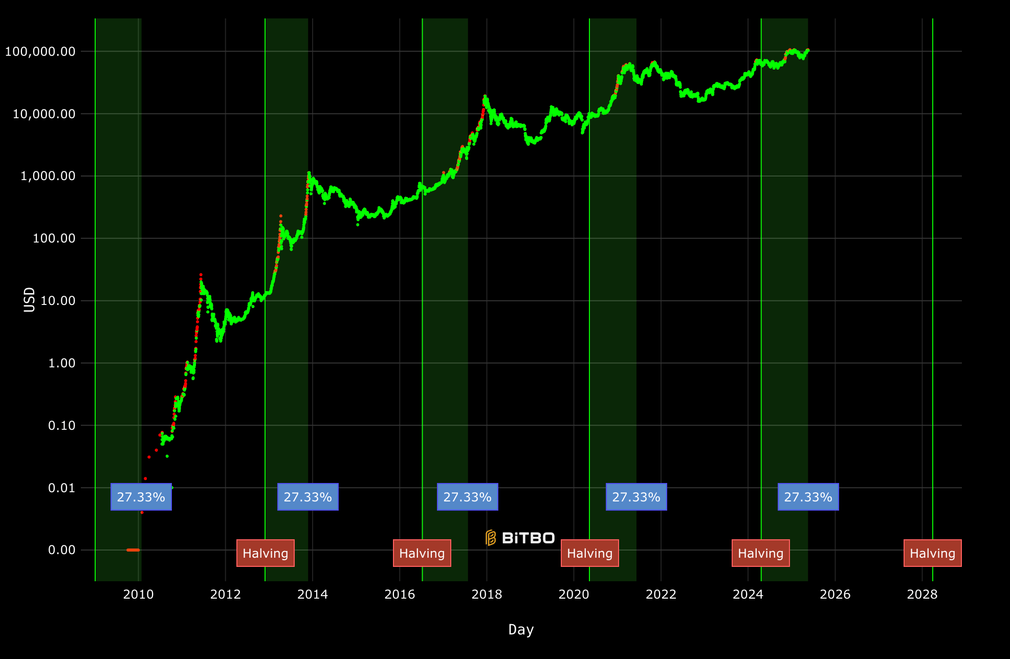 Current drawdown (~47%) aligns with historical correction behavior. Next halving is expected in 2028.