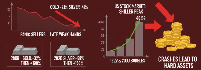 Gold fell from $5,600 to $4,900. Silver collapsed from $121 to $75 in days.