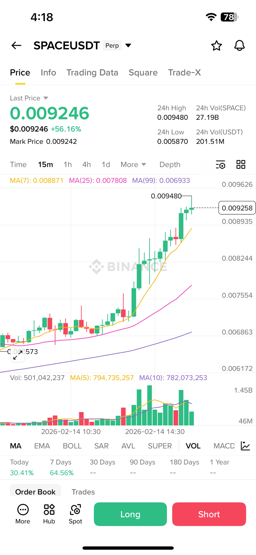 • Price well above all MAs (MA7 ~0.00889, MA25 ~0.00778, MA99 ~0.00693) → clear bullish stack.
