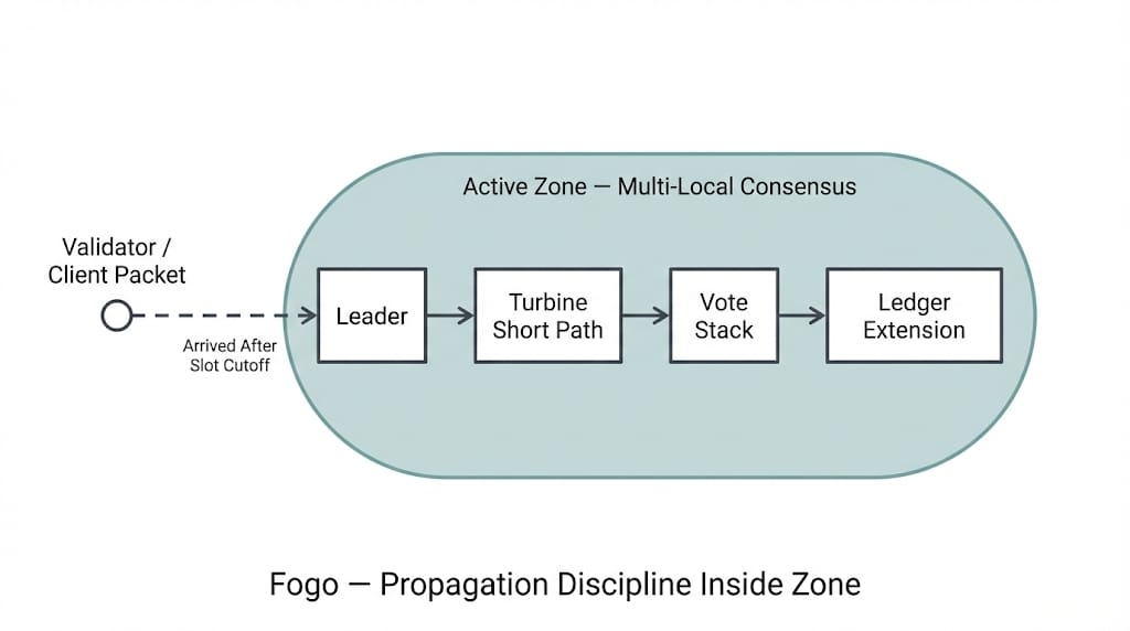 On Fogo, indecision shows up as a late packet. That’s all it takes. Active validators in the zone produce on schedule. Votes return. Ledger extends. Whether you were inside the window or staring at it from outside.