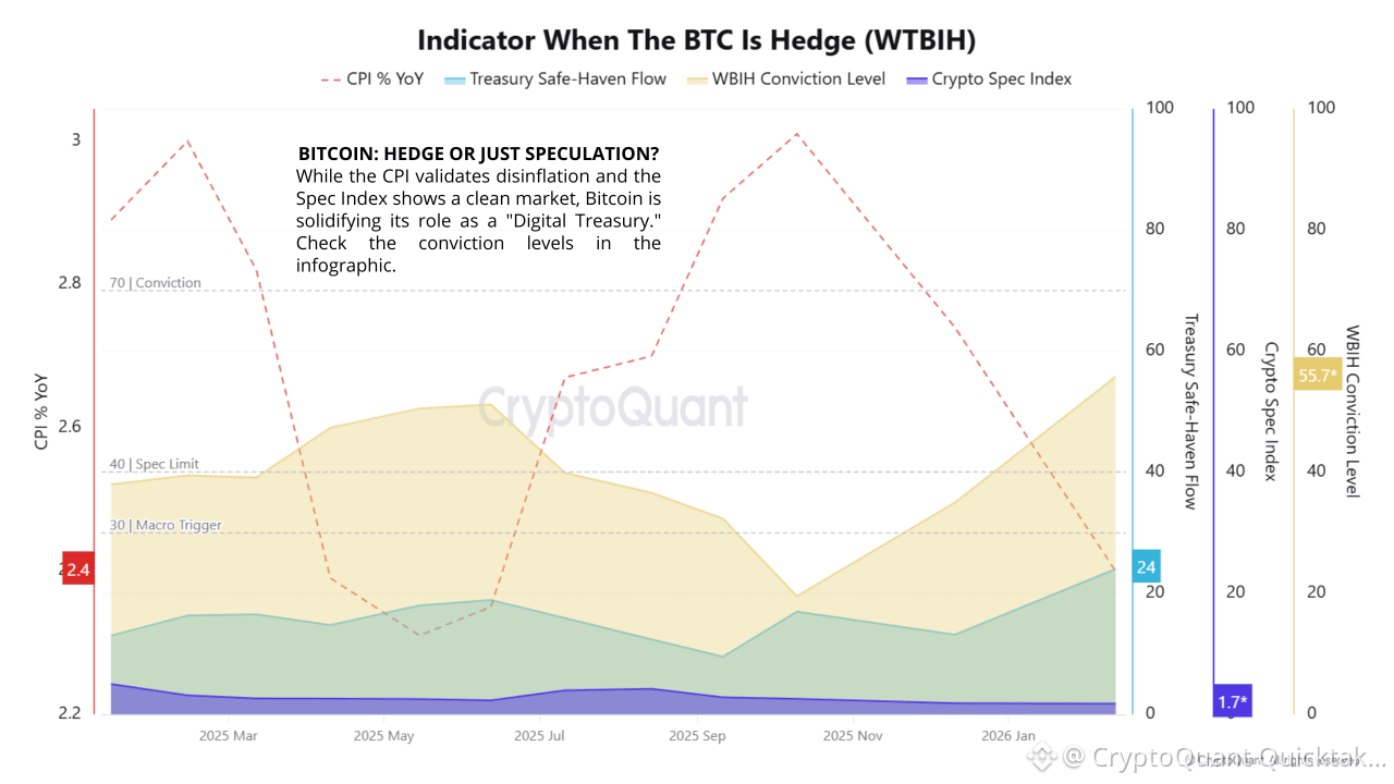 ◾WTBIH Conviction Level (55.74) → The Conviction Zone (70) will be reached when the Treasury Safe-Haven Flow breaks the 30-point trigger. Currently, the index signals technical accumulation but does not yet classify BTC as a hedge.