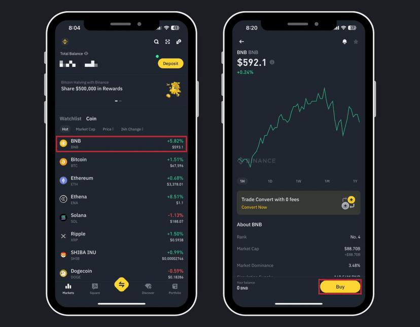 Click on the cryptocurrency you want to buy. Let's say you want to buy BNB. Click on BNB, a page will appear on which you will see a simple BNB trend chart, the current price, and coin specifics.