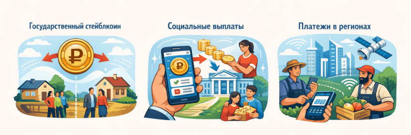 The practical value of state stablecoins emerges in scenarios for the distribution of social transfers and subsidies. Transferring funds to digital wallets makes the process more efficient, reduces transaction costs, and decreases the risk of loss of funds on their way from the budget to the recipient. For the recipient, this means the ability to instantly use funds, pay for services, and purchase goods without going to a cash register or bank branch.