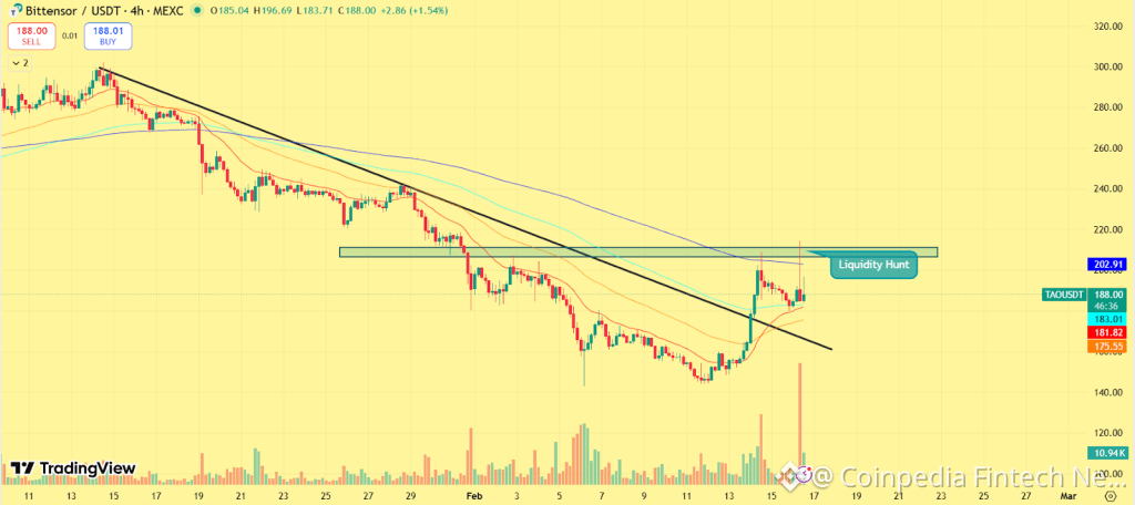 Amid the listing confirmation, TAO price reacted sharply as buyers rushed into the new Korean market access narrative, pushing price sharply toward the $200-$210 region within a few minutes. The move looked impulsive at first glance, but follow-through never developed. Instead of continuation, the rally stalled right after sweeping the round-number liquidity resting above $200, a level that had repeatedly acted as a magnet for stop orders.