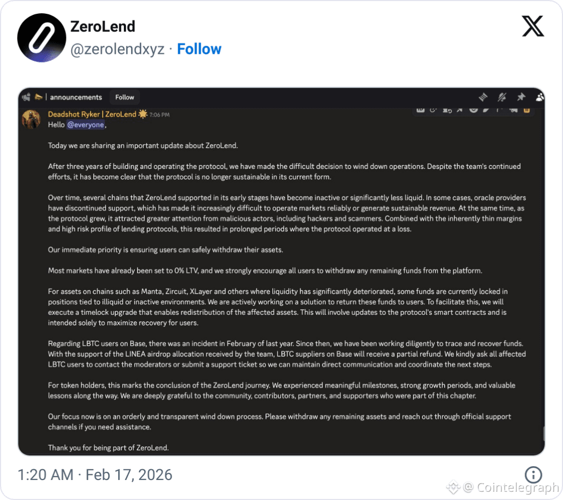 ZeroLend’s Ryker said the reason for the shutdown is that several blockchains the protocol supported “have become inactive or significantly less liquid.”