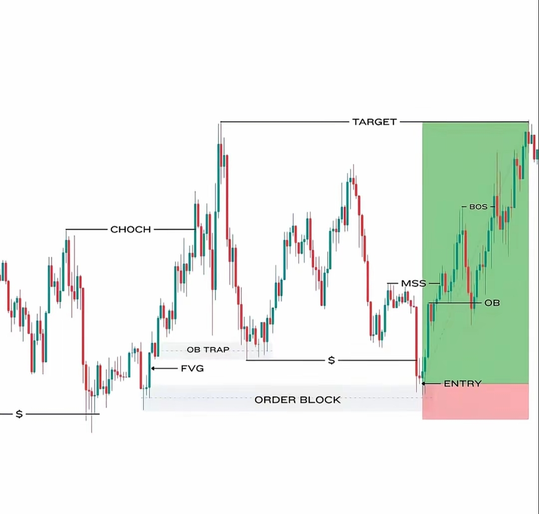 These charts demonstrate institutional logic. BOS confirms continuation. CHOCH warns of change. MSS confirms shift. Order Blocks show institutional zones. FVG reveals imbalance. Liquidity shows targets. Entry comes after confirmation. Target lies at liquidity.