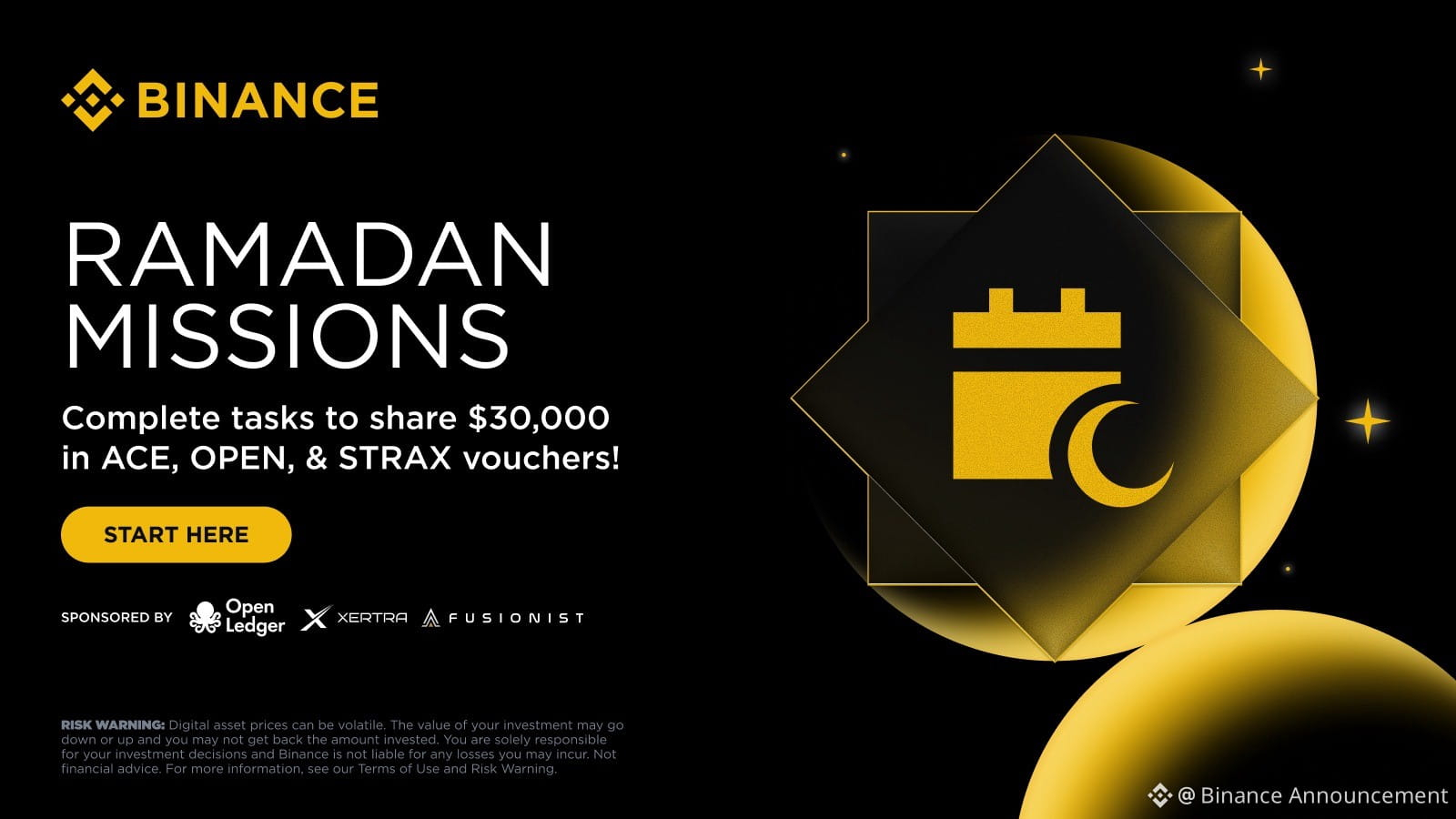 This Ramadan, Binance invites you to take part in Ramadan Missions 2026, where eligible users can complete daily trading and referral tasks to earn points and unlock a share of $30,000 in OPEN, ACE, and STRAX token vouchers.
