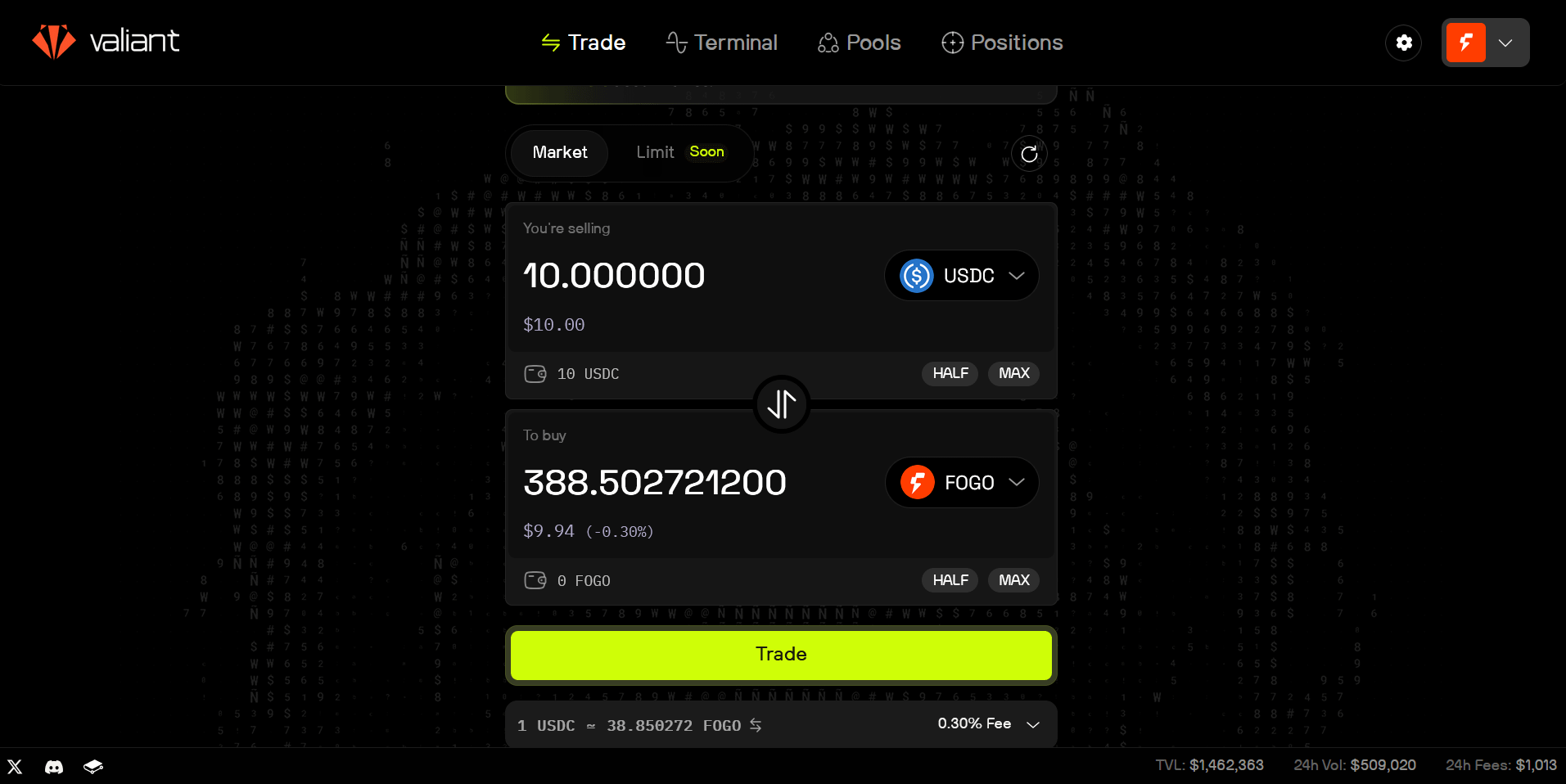 Here is the swap I made, USDC into $FOGO on Valiant. You can see the fixed 0.30 percent liquidity fee and he smooth execution in the screenshot.