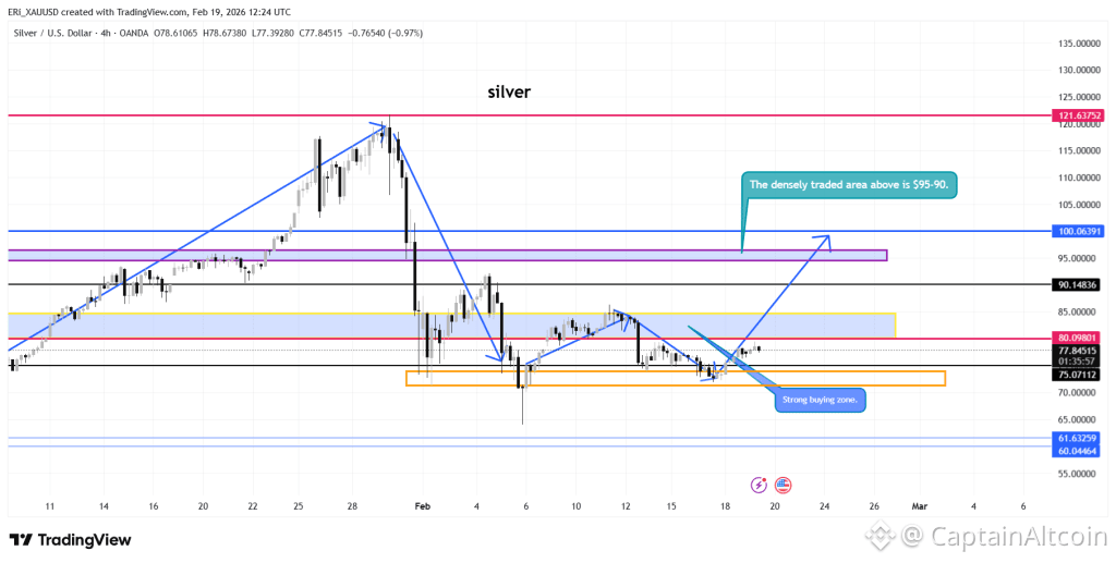 Looking at the chart, the structure around the silver price is actually pretty clean. The strongest support sits in the $70–$75 area, which is marked as a “strong buying zone.” Every time price has dipped into that region, buyers have stepped in and defended it.
