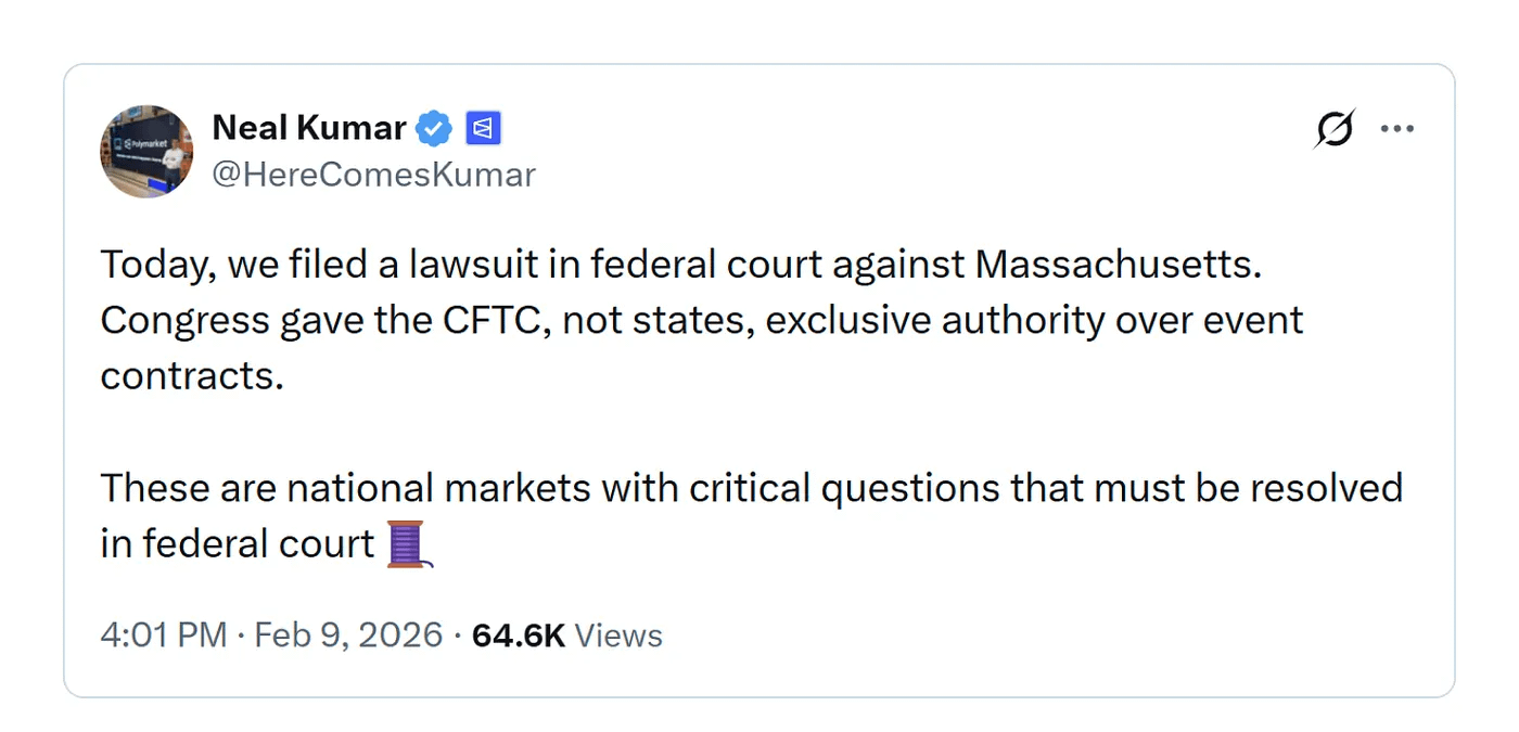 Polymarket chief legal officer Neal Kumar argues that the dispute involves national markets and that the relevant legal questions should therefore be resolved in federal court. The company opposes piecemeal enforcement by individual states. He said that restricting markets could hinder industry development.