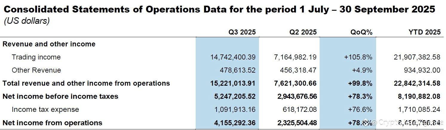 Finanx AI’s Q3 2025 financials point to genuine strength. The company reported trading income of US $14.74 million for the three months ended 30 September 2025, up 106 percent quarter-on-quarter, and net cash provided by operating activities of US $4,472,578.90. It carried no debt or external borrowings, reflecting a clean balance sheet. Year-to-date net income totalled US $6.48 million, showing profitability across multiple quarters rather than an isolated result.
