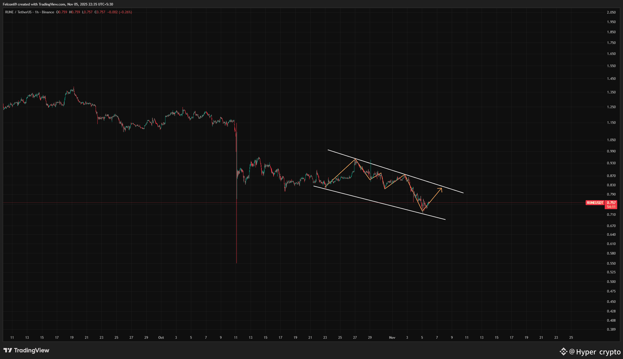 I can see RUNE formed a falling wedge 🔻 pattern, defined by two converging, downward-sloping white trendlines. A falling wedge is a strong bullish reversal pattern ⬆️, as it signals that selling momentum is weakening. RUNE price will initiate a strong breakout 🚀 above the upper line, signaling a move toward the $0.90 area.