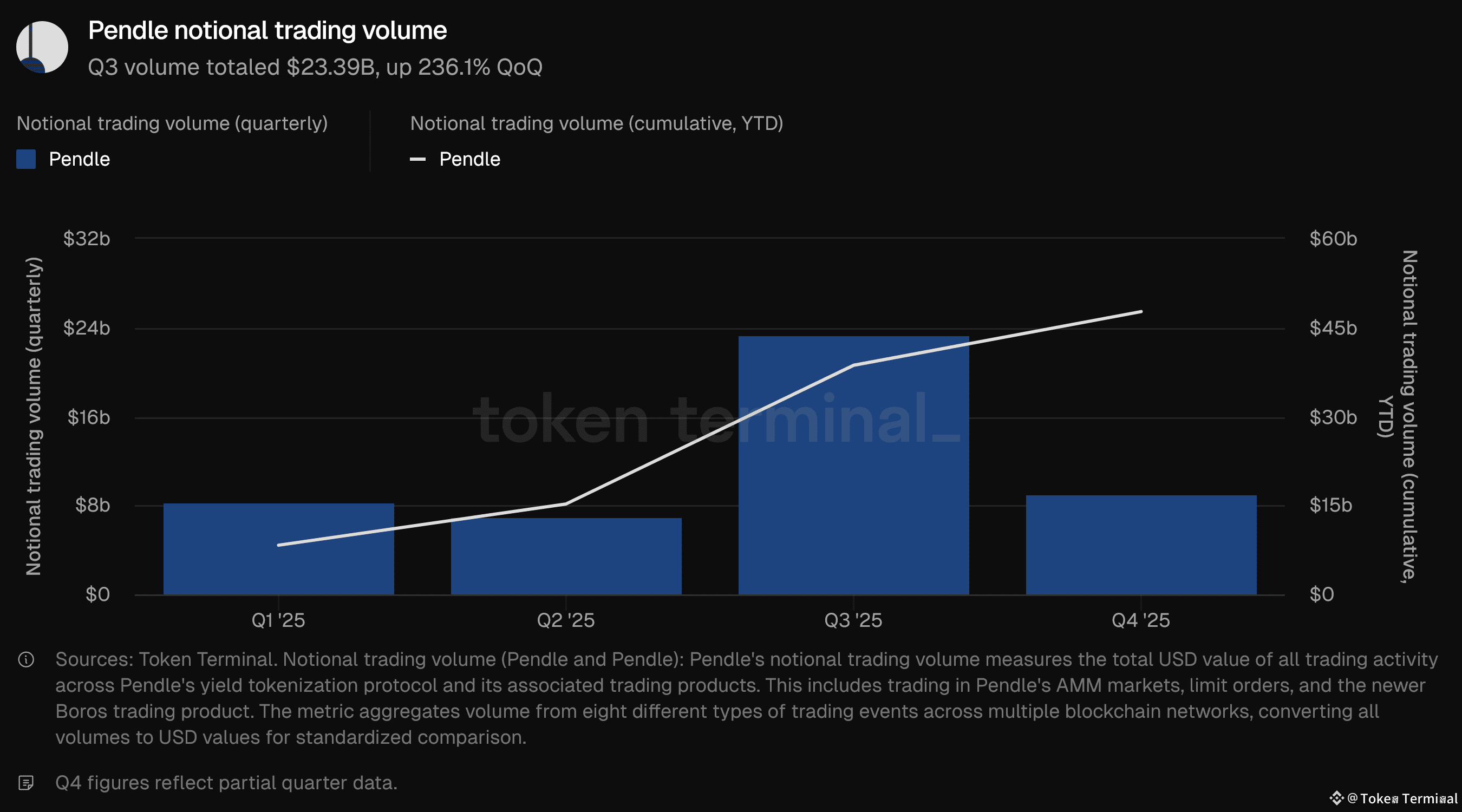 Pendle, launched in 2021, is the world's largest crypto yield-trading platform. The project enables the tokenization and trading of onchain yield via principal (PTs) and yield (YTs) tokens, and offchain interest-rate exposure through its recently launched Boros product. Token Terminal tracks Pendle across 8 chains and 5 products. Pendle saw growth across key metrics in Q3.
