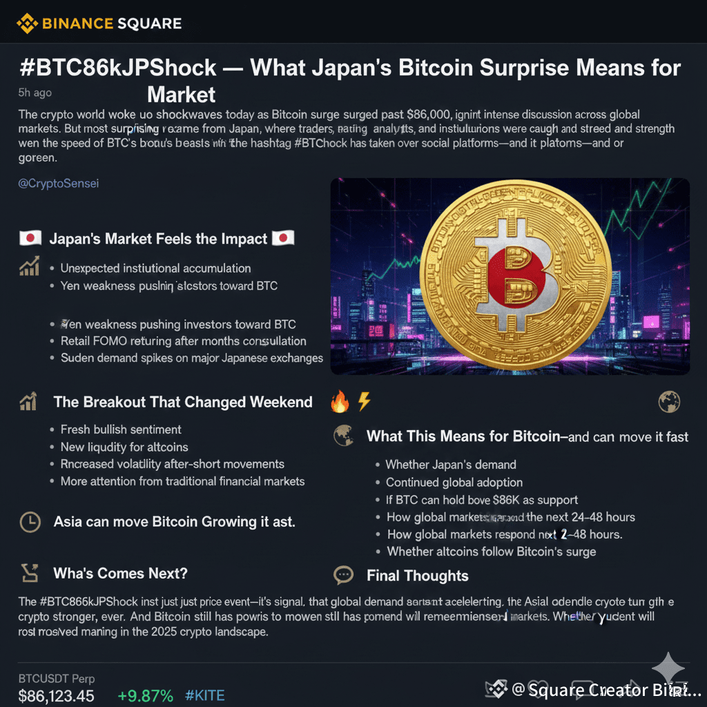 The crypto world woke up to shockwaves today as Bitcoin surged past $86,000, igniting intense discussion across global markets. But the most surprising reaction came from Japan, where traders, analysts, and institutions were caught off guard by the speed and strength of BTC’s breakout. The hashtag #BTC86kJPShock has taken over social platforms—and for good reason.