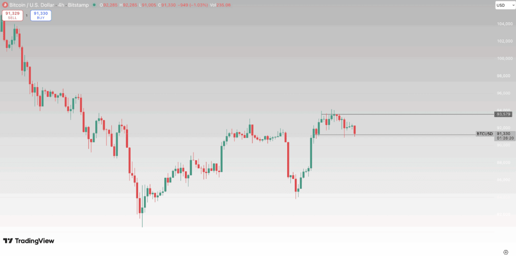 Currently, there is no significant movement in both Bitcoin and Ethereum on the small time frame. Bitcoin has been stuck in the range of $91,000 to $93,500 for the past two days. As soon as the price goes outside this range, it returns to that same four-hour candle.