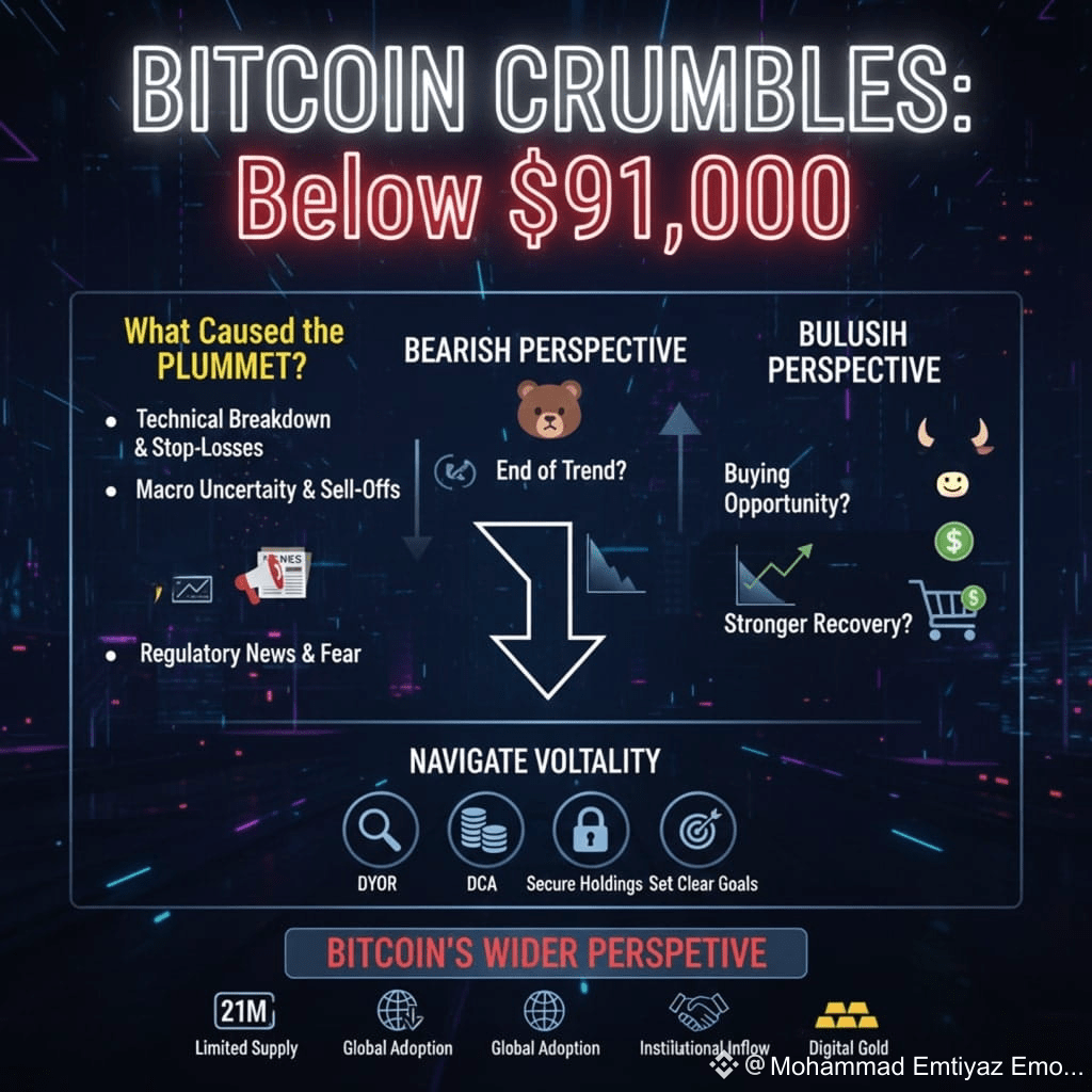 Bitcoin Price Crumbles as BTC falls below $91,000, triggering concern across the crypto market and raising questions about whether this drop signals a deeper correction.