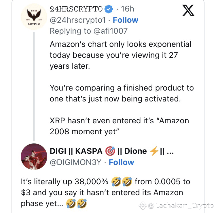 In response, 24hrscrypto1 argued that Amazon’s chart only appears exponential today because we are viewing it 27 years later. “You’re comparing a finished product to one that’s just now being activated,” he remarked. He added that XRP hasn’t even reached its “Amazon 2008 moment” yet.